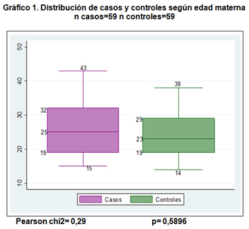 En relación a las variables sociodemográficas, se observó que la edad de las madres en los casos fue de un límite inferior de 15 años y el límite superior de 43 años (Gráfico 1), en la situación conyugal, se encontró que el 42% mantenían una unión libre, el 30% eran casadas y el 28% solteras; según el nivel de instrucción, el 51% realizó la primaria, el 37% la secundaria, el 9% universitaria, el 3% eran analfabetas y la ocupación de las madres para los casos, el 93% se dedica a los quehaceres domésticos, el 3% funcionaria del sector público, el 2% trabajadora independiente, mientras que el 2% fueron estudiantes.