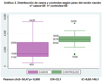 El peso al nacimiento en los casos se encontró el límite inferior en 400 gramos, el límite superior en 5420 gramos. Por su parte en los controles se encontró un límite inferior de 1400 gramos, el límite superior 5200 gramos. Al realizar el análisis estadístico del peso al nacimiento este es un factor de riesgo asociado a la mortalidad neonatal, donde se encontró que existe una fuerza de asociación de 33,1 (IC= 95% 9,65-140,1). (Gráfico 2)