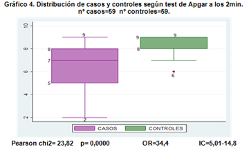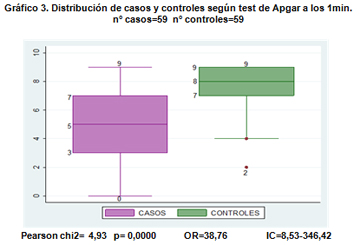 Según el test de Apgar al minuto de vida en los casos se encontró el límite inferior de 0, el límite superior en 9 puntos. Por su parte, en los controles se encontró el límite inferior de 2, el límite superior en 9 puntos. Estadísticamente tiene asociación con la mortalidad neonatal, encontrándose una fuerza de asociación de 38,76 (IC= 95% 8,53-346,42). En el test de Apgar a los 5 minutos de vida en los casos se encontró el límite inferior en 2, el límite superior en 9 puntos. Por su parte en los controles se encontró el límite inferior en 6, el límite superior en 9 puntos. Esto analizado estadísticamente demostró ser también un factor de riesgo para la muerte neonatal, donde se encontró que existe una fuerza de asociación de 34,4 (IC= 95% 5,01-14,8). (Gráfico 3)