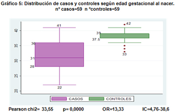Con respecto a la edad gestacional, en los casos se encontró el límite inferior en 22 semanas y el límite superior en 41 semanas. Por otro lado, en los controles se encontró el límite inferior en 33 semanas y el límite superior en 42 semanas. El análisis estadístico de la edad gestacional al nacer como factor de riesgo asociado a la mortalidad neonatal se encontró que existe una fuerza de asociación de 13,33 (IC= 95% 4,76-38,6). (Gráfico 4)