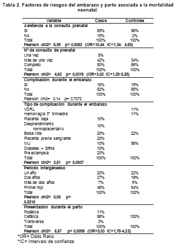 En relación a los controles prenatales, en los casos el 85% si tuvieron, completando el 50% de las consultas adecuadas, mientras tanto en los controles el 98% si tuvieron controles prenatales, donde el 66% de las mujeres completaron los controles requeridos. Al realizar el análisis estadístico, el no cumplimiento de las consultas prenatales es un factor de riesgo para la mortalidad neonatal, donde se encontró que existe una fuerza de asociación de 3,02(IC= 95% 1,20-5,28). El 11% de los casos el tipo de presentación fue la podálica, en el 86% de los casos fue cefálica y en el 3% de los casos fue transversa, por otro lado en el 100% de los controles fue cefálica. Al analizar estadísticamente el tipo de presentación del parto como factor de riesgo para la muerte neonatal se encontró que existe una fuerza de asociación de 5,03 (IC= 95% 1,78-4,22). (Tabla 2)