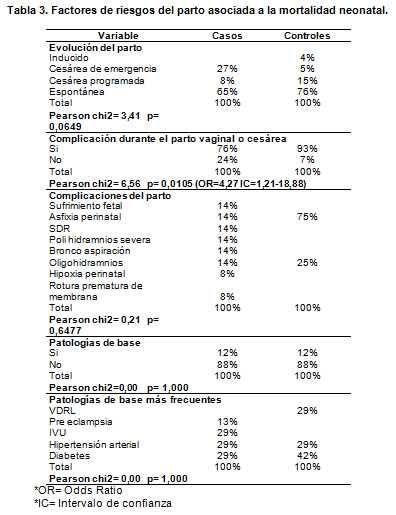 En un 24% de los casos existieron complicación durante el parto o cesárea y en un 76% no se dio ninguna complicación, por otro lado, en un 93% de los controles no hubo complicación durante el parto o cesárea y en un 7% de los controles si hubo complicación durante el parto o cesárea. La presencia de complicación durante el parto o cesárea es un factor de riesgo para la muerte neonatal, encontrándose estadística significativa con una fuerza de asociación de 4,27 (IC= 95% 1,21-18,88). (Tabla 3)