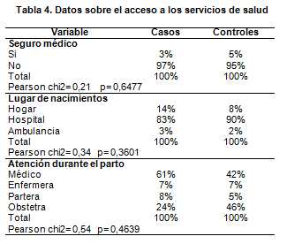 Con relación a los servicios de salud, esta variable en este estudio no fue al acceso un factor de riesgo para la mortalidad infantil. Pero se encontraron los siguientes datos: con respecto a la distribución del lugar de nacimiento en un 14% de los casos ha nacido en el hogar, en un 83% de los casos ha nacido en el hospital y en un 3% de los casos ha nacido en una ambulancia, por otro lado en un 8% de controles ha nacido en el hogar, en un 90% ha nacido en el hospital y en un 2% ha nacido en una ambulancia. En un 61% de los casos el parto fue atendido por el médico, en un 7% de fue atendido por la enfermera, en un 8% fue atendido por la partera empírica y en un 24% fue atendido por la obstetra, por tanto en un 42% de los controles el parto fue atendido por el médico, en un 7% fue atendido por la enfermera, en un 5% fue atendido por la partera empírica y en un 46% fue atendido por la obstetra. (Tabla 4)