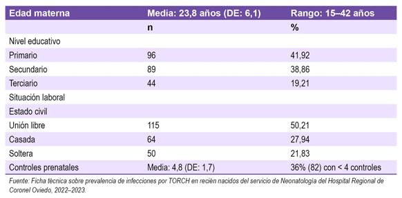 En cuanto a las características maternas, la edad promedio fue de 23,8 años (DE = 6,1; rango: 15 - 42 años). El 41,92% (96) de las madres poseía nivel educativo primario, y el 38,86% (89) nivel secundario, y respecto al estado civil de las gestantes se distribuyó en 50,21% (115) estaba en unión libre, y 27,94% (64) casadas. El número promedio de controles prenatales fue de 4,8 (DE = 1,7), siendo que el 36% de las gestantes recibió menos de cuatro controles. (Tabla 1)