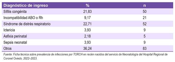 De los 229 recién nacidos estudiados, el 21,83% (50) fue ingresado con el diagnóstico de sífilis congénita, el 9,17% (21) con incompatibilidad ABO o Rh, el 3,93% (9) con ictericia, el 2,18% (5) con asfixia perinatal, el 3,93% (9) con sepsis neonatal y el 36,24% (83) con otros diagnósticos. (Tabla 2)