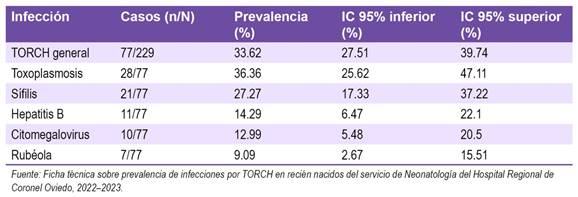 De los 77 recién nacidos con diagnóstico de TORCH, el 36,36% (28) (IC 95%: 27,5-39,7) fue diagnosticado con toxoplasmosis congénita, el 27,27% (21) con lúes congénita, el 14,28% (11) con hepatitis B, el 12,98% (10) citomegalovirus y el 9,09% (7) con rubéola congénita. (Tabla 3)