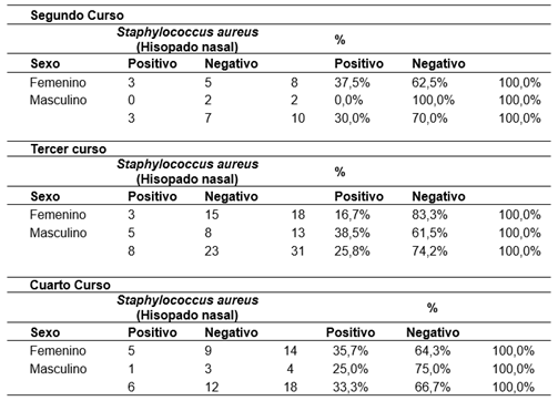 En relación a la prevalencia de Staphylococcus aereus en estudiantes por curso se observa, que en el segundo curso fue del 30%, destacándose una proporción mayor en el sexo femenino en comparación con el masculino. Esta diferencia se explica en parte por el reducido número de varones en este curso, lo que limita la posibilidad de identificar casos positivos en ese grupo. No obstante, el resultado global sugiere una colonización moderada entre los estudiantes del segundo curso, posiblemente relacionada con el inicio de exposiciones clínicas y el desarrollo progresivo de competencias en el ámbito hospitalario.