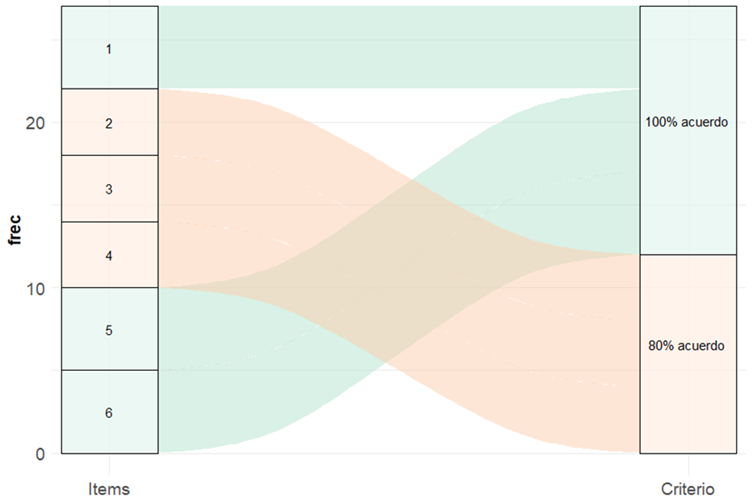 En la primera fase, se trasladaron las respuestas de la tercera instancia de la adaptación del Psy-Flex a una hoja de cálculo para evaluar las respuestas de los jueces. De este modo, se fijó un número equivalente entre 5 a 10 para estimar la variabilidad de la muestra de acuerdo a su claridad, relevancia y pertinencia 34. Mediante el índice “V” de Aiken con intervalos de confianza al 95 % 35-37, se tomó en consideración valores óptimos (V>.70) para mantener el ítem 38 y, dado que los jueces se encontraron en distintos escenarios, se exploró las discrepancias entre los coeficientes en función de las variables sociodemográficas relevantes utilizando el coeficiente “h” para “V” de Aiken 37. Dichos coeficientes se resumieron con el gráfico aluvial 39.