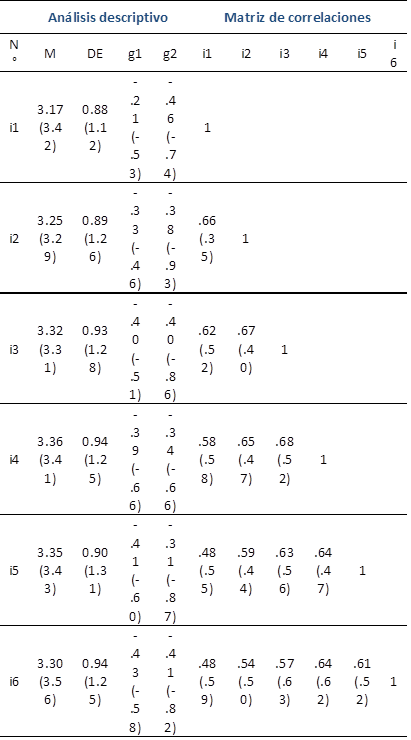 La Tabla 1 muestra los estadísticos descriptivos y la matriz de correlaciones de los ítems del Psy-Flex. Como se observa, la media de todos los ítems se situó en torno a 3 y la DE alrededor de 0.90. Del mismo modo, las medidas de asimetría y curtosis se situaron en el rango entre (-1, +1);, lo que indica el cumplimiento de la aproximación a la normalidad univariante. Además, al analizar las correlaciones ítem-test se comprobó que la escala presentó una consistencia adecuada, sin solapamientos, y la significancia de los coeficientes de correlación fueron estadísticamente significativos (p<.05).