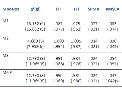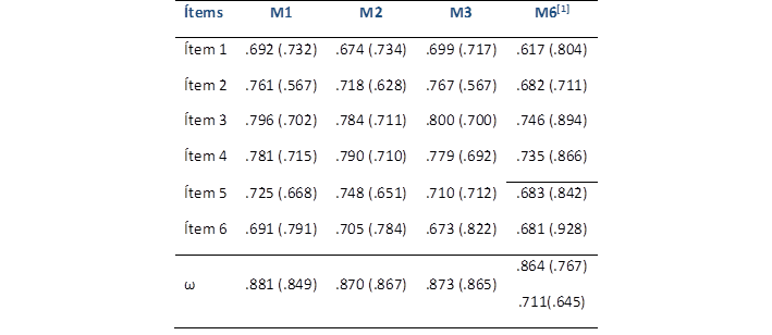 En la Tabla 2 se presentan los índices de ajuste de los modelos del Psy-Flex que se evaluaron para las dos aplicaciones: unidimensional (M1), Psy-Flex con errores correlaciones de los ítems 1 y 2, 2 y 3, 1 y 5 (M2), modelo con errores correlacionados de los ítems 5 y 6 (M3), modelo de tres dimensiones ortogonales (M4) y tres dimensiones correlacionadas (M5). Los modelos unifactoriales mostraron un ajuste excelente, los cuales tuvieron mayor ajuste mientras se restringió las correlaciones entre errores. En cuanto a los modelos de tres factores correlacionado (M4) y no correlacionado (M5), al evaluar su ajuste sin permitir correlaciones entre los factores, se obtuvieron soluciones inadecuadas y no convergieron (e. g. casos Heywood), por lo tanto, fueron eliminadas para posteriores comprobaciones. Sin embargo, en la inspección de la identificación de las matrices del cuarto modelo, se evidenció la presencia de una correlación muy cercana a la unidad entre las dimensiones “apertura” y “conciencia”, por lo cual, se sumaron los reactivos 2 y 3 de la primera dimensión con los reactivos 1 y 4 de la segunda dimensión. En consecuencia, se generó un sexto modelo configurado por dos dimensiones: Mindfulness y Proceso de Aceptación (ítems 2, 3, 1 y 4) y Compromiso y Procesos de Cambio de Conducta (ítems 5 y 6) (M6).