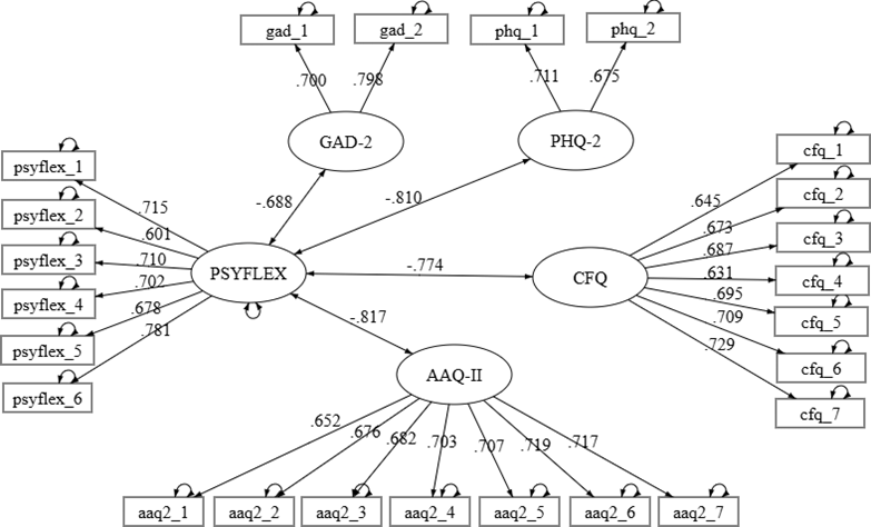 Con respecto al análisis de evidencias en relación a otras variables, los hallazgos de las segunda medición señalaron que existe una carga factorial inversa estadísticamente significativa del modelo latente sin restricciones del Psy-Flex con las puntuaciones del modelo GAD-2 (λ_s=-.688; p=.000), PHQ-2 (λ_s=-.810; p=.000), CFQ (λ_s=-.744; p=.000) y AAQ-II (λ_s=-.817; p=.000), el modelo tuvo un ajuste aceptable en sus índices absolutos (χ^2/df= 1.520; SRMR=.047; RMSEA=.057; IC 95%[.045:.069]) y relativos (CFI=.936; TLI=.927). (Figura 3)