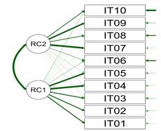 De igual manera, en los gráficos 2 y 3, se confirma que efectivamente el mismo consta de dos factores que miden la autoestima, los primeros 5 ítems de manera positiva y los restantes 5 ítems planteados de manera negativa. La medida de unicidad nos arroja el resultado de que los ítems poseen una correcta varianza única; se verificó que los factores poseen una gran cantidad de varianza al contrastar con el conjunto de datos.