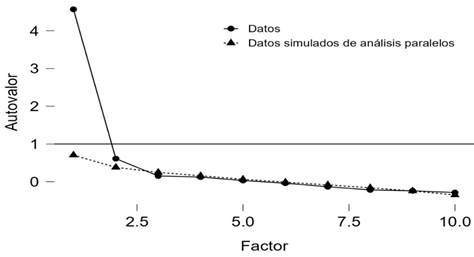 No obstante, se realizaron las pruebas de esfericidad de Bartlett (χ²= 50,982; gl = 26; p = 0,002) y el análisis KMO (= 0,874), que son valores de la medida de adecuación muestral Kaiser-Meyer-Olkin(22); dichos resultados sugieren que es apropiada la realización de un análisis factorial exploratorio.