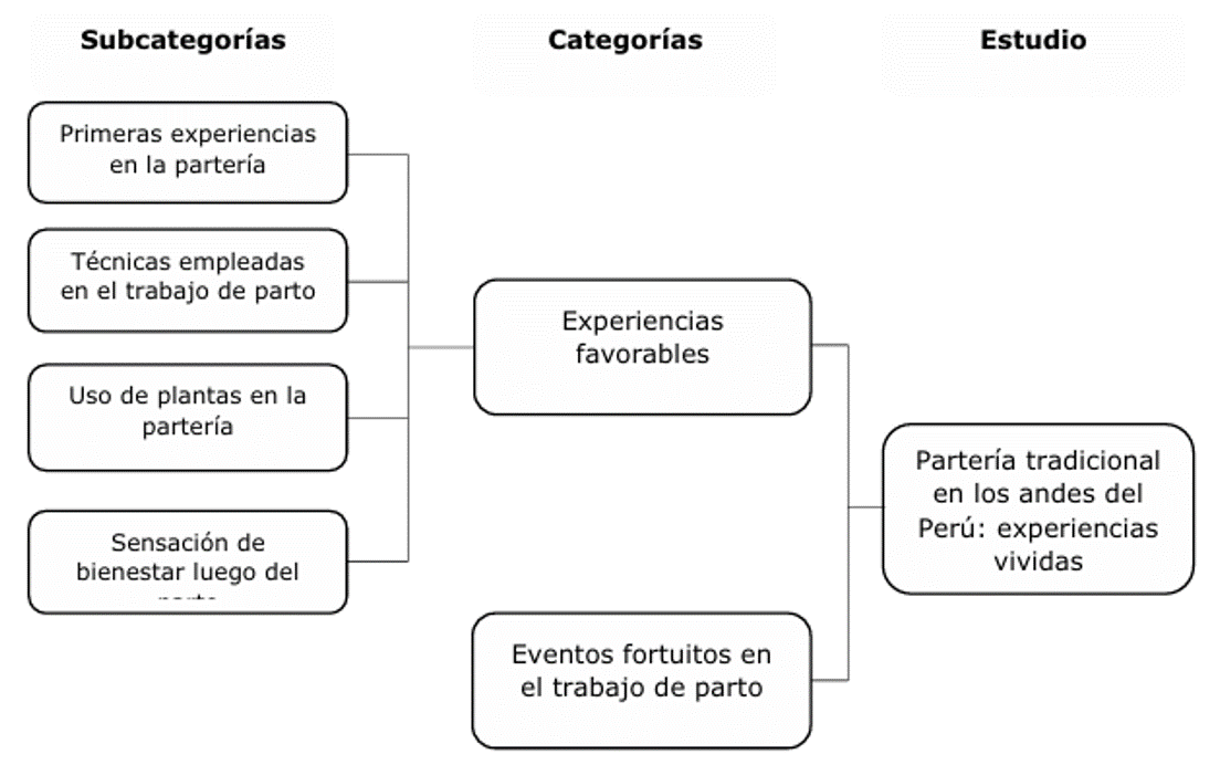 Las experiencias favorables de las parteras representan a aquellos hechos que marcaron un hito importante en sus vidas y que les motivó a continuar con la práctica de la partería, por obtener los resultados deseados en la mayoría de casos. La categoría se constituye por las subcategorías: primeras experiencias en la partería, técnicas empleadas en el trabajo de parto, uso de plantas en la partería, sensación de bienestar luego del parto.