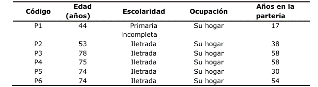 Integraron el estudio seis parteras tradicionales habitantes de la comunidad de Pampa La Laguna, provincia de Chota, Perú, su edad promedio fue de 70,8 (10,0) años, el 83,3% no tuvieron instrucción, todas se dedicaban a su hogar como ocupación y tuvieron 42,5 (16,9) años en promedio habiendo desarrollado la práctica de la partería, sus atributos más resaltantes se presentan en la siguiente tabla 1.