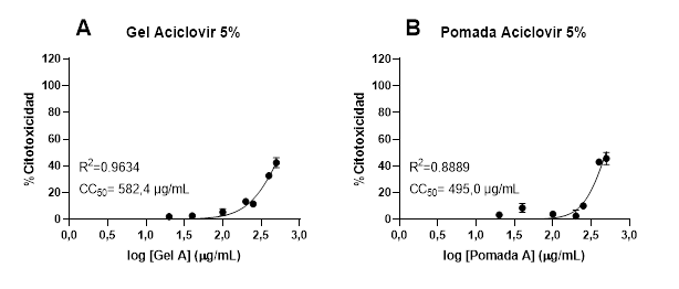 Al analizar la citotoxicidad de las formulaciones con aciclovir 5% se obtuvieron valores de CC50 de 582,4 μg/mL (r2=0,9634) (Figura 2A) y 495,0 μg/mL (r2=0,8889) (Figura 2B) para el Gel de Aciclovir y la Pomada de Aciclovir respectivamente, siendo estos valores un poco mayores a los CC50 obtenidos de las bases, comprobando así, una ligera influencia del activo sobre la toxicidad del sistema en estudio. Las concentraciones utilizadas para el análisis fueron de 500, 400, 250, 200, 100, 40 y 20 μg/mL.
