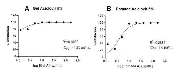 Para el caso del gel de aciclovir, se obtuvieron valores de IC50 ˂1,25 μg/mL (r2=0,908), ya que se observaba un fenómeno de inhibición viral mayor al 70% incluso en la menor concentración de ensayo (Figura 3A). En el caso de la Pomada de Aciclovir se obtuvo un valor de IC50 de 3,6 μg/mL (r2=0,889) (Figura 3B). El Gel presentó mejores valores de IC50 en comparación a la Pomada que puede deberse a la naturaleza hidrofílica y polimérica del gel, que permite un mejor contacto con el sistema de ensayo.